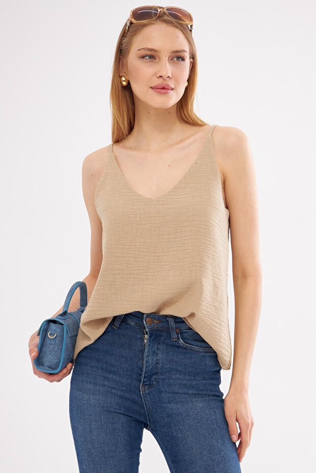 armonika Kadın Pembe Keten Görünümlü Askılı Bluz ARM-24Y001064
