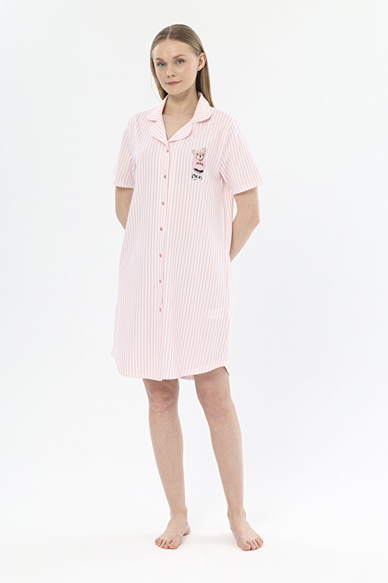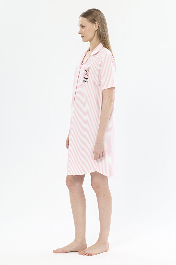 Регулярная приталенная хлопковая вязаная женская ночная рубашка с коротким рукавом и рисунком мишки в полоску, 251K32SV, розовая - 5.
